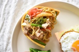 4.e-trayにレタスを敷き、タコミート、サルサソース、アボカド、ピザ用チーズをお好みでトッピング