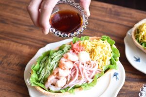錦糸卵、ハム、えび、きゅうり、紅しょうが、マヨネーズをトッピング。