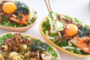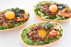 4. e-tray にお好みでごはんやうどん、焼きそば麺を盛り付け、肉みそを上に乗せ、トッピングも好きなものを乗せて完成