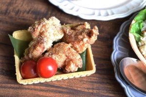 から揚げ。油が気になら料理は、下に葉っぱや野菜を敷いても♩